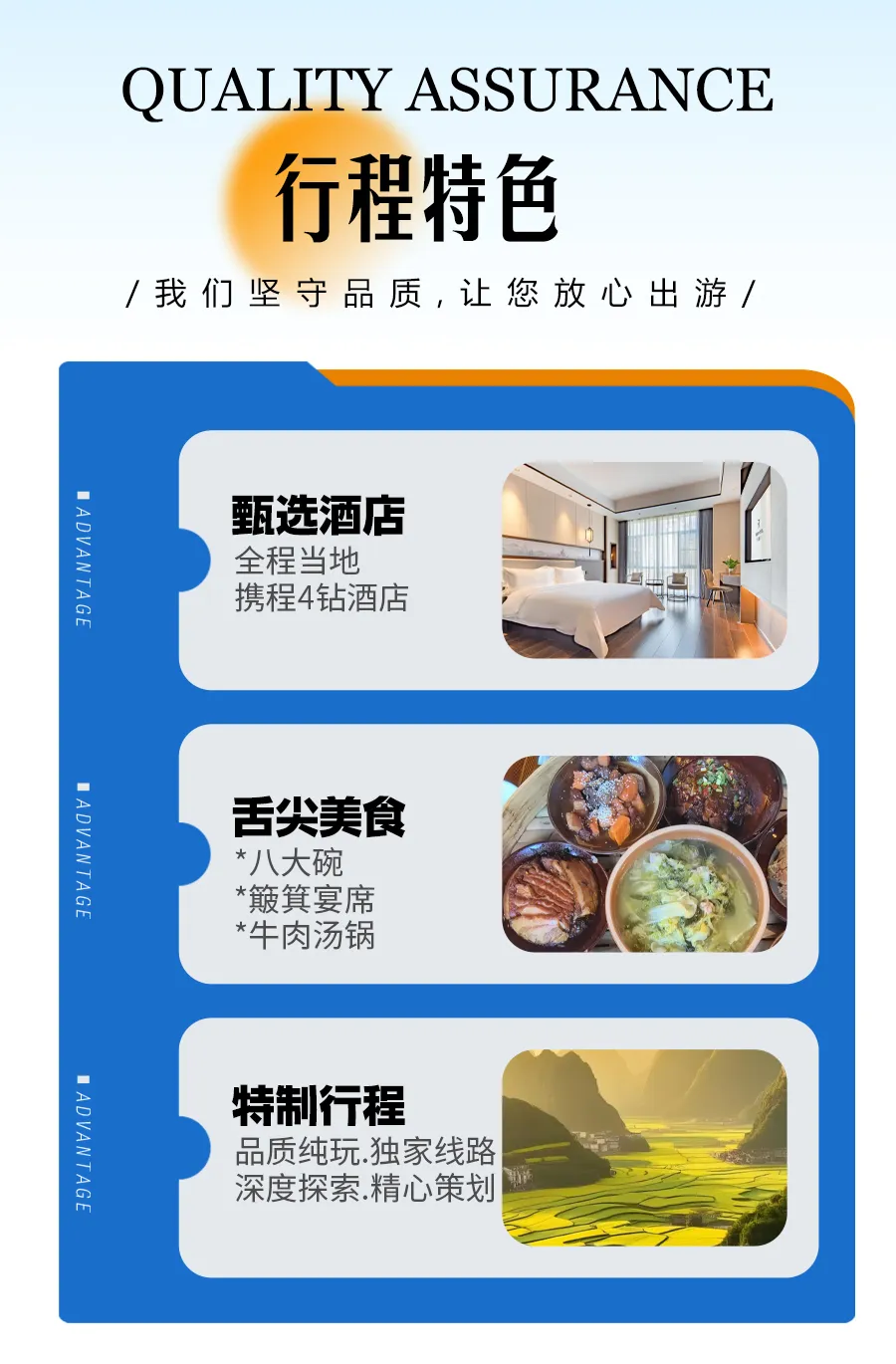 2、住宿:全程当地携程4钻酒店,(贵州酒店基本无三人间,若产生单男或男女请客人自付单房差)