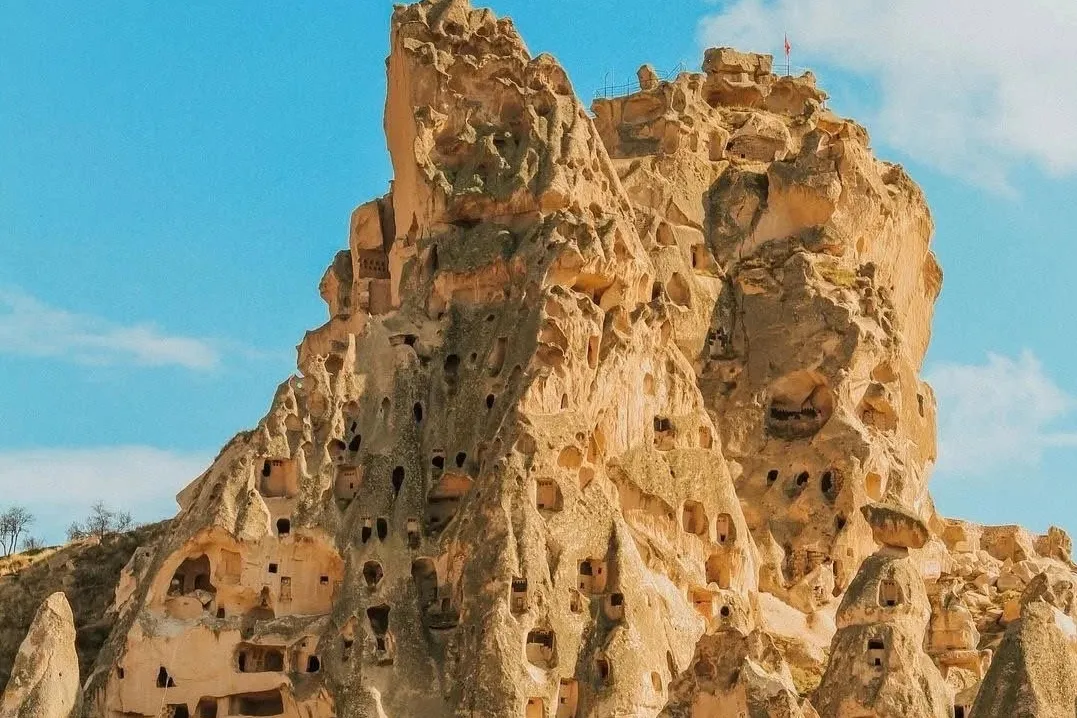 早餐后,前往游览【乌奇萨城堡】(外观游览约15分钟)是卡帕多奇亚最高和最大的岩石建筑,曾经是拜占庭时期的避难所,同时也是奥斯曼帝国的军事要塞。【鸽子谷】(外观游览约15分钟)位于格莱美国家公园附近,是一个天然的自然景观,因沿途彩色的鸽舍而得名。【爱情谷】(外观游览约15分钟)位于土耳其中部的卡帕多奇亚地区的国家公园内。这里有很多令人脸红心跳的自然结构,这些结构高耸入云,形态逼真,故委婉的称它为爱情谷,是土耳其最受欢迎的旅游景点之一。除此之外,这里还是亚洲最好的远足路线。【仙人烟囱】(外观游览约15分钟),这里除了有卡帕多西亚最高的仙人烟囱之外,玄武岩的仙人烟囱全是多头式、尖帽式的,非常特别。高耸入天的仙人头像下就是教堂,原来是公元5世纪时隐士圣西蒙(St Simeon)的隐修所,至今保留完整。【格雷梅露天博物馆】★(含门票,游览约120分钟),作为土耳其的世界级文化遗产,格莱梅露天博物馆集中了数量众多的装饰着精美壁画的岩窟教堂和清真寺。岩窟教堂的石灰壁画,都是用石灰涂在墙上,在石灰潮湿的时候,把颜料调好后涂在石灰上,壁画的内容以圣经为主。继续前往游览【迪夫里特峡谷】,这里是卡帕多西亚地区形状最奇特、分布最集中的火山石锥群。著名的骆驼形状的岩石就在这里。数百个高度从几十米到100多米不等的石锥紧密排列,当地独特的岩层是烟囱形成的原因,由于表面一层薄而坚硬的玄武岩,保护着下面白色松软的凝灰岩免遭风雨的侵蚀,日久天长形成了今天的形态。
