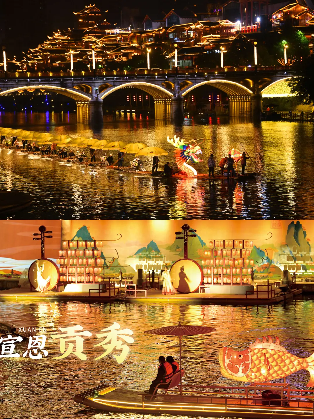 后前往游览【仙山贡水旅游区】(游览时间约1小时),是湖北省唯一一个以县城为核心区域的国家4A级旅游景区,主要景点有老院子、民族风情街、文澜桥、贡水河音乐喷泉、墨达楼、苗族钟楼等。晚上欣赏夜景的同时可自费前往惹虹桥码头自费乘坐竹筏体验贡水泛舟之乐。