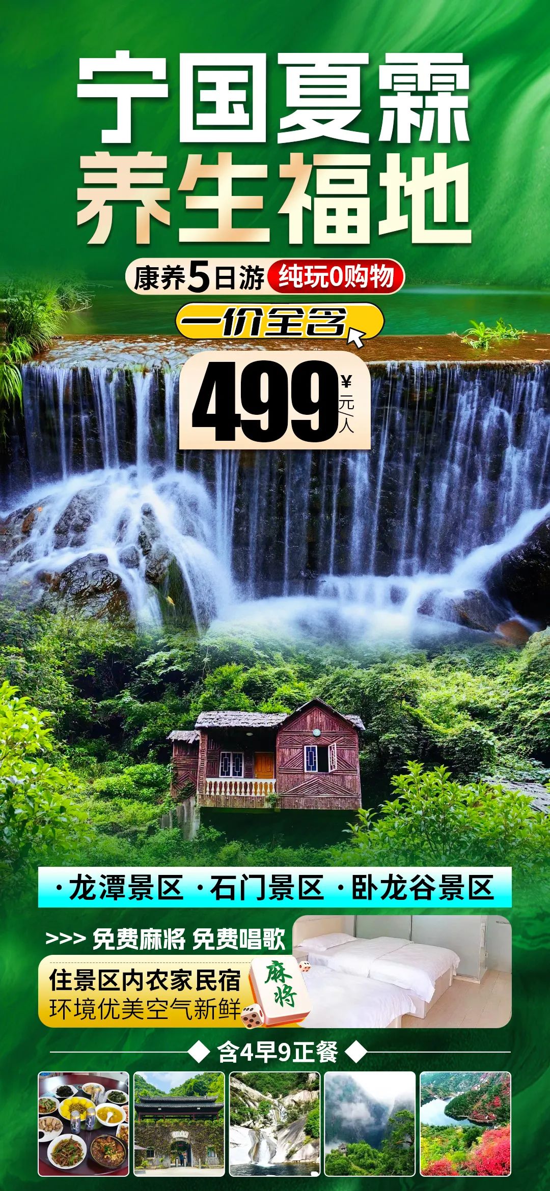 行程特色 纯玩游宁国 No.1 景点篇 龙潭景区 龙潭瀑布落差10余米,如白练悬壁,溅起白莲朵朵,潭面有天然石联成三维桥;两石山并立, 狭缝仅4米,形成“一线天”,浅溪穿峡流过,风和日暖时数百彩蝶翩翩起舞;龙头坎石壁高耸入云,谷底深潭波光粼粼;三级瀑布和连环石鸡凼,如观音洒水终年不枯。三、五一步一瀑布,由于水流常年不断,可堪称皖南第一大瀑布群;又由于河水常年冲蚀,形成的峡涧水清石奇,叠荡起伏的涧水给夏林以良好的森林植被。 卧龙谷景区 国家4A级旅游区----大鄣山卧龙谷风景区是一处纯自然、纯生态、纯原始的峡谷景区,是“最美乡村”的骄子 石门景区 乘坐电瓶车上山游玩石门风景区,石门、龙须瀑 乌龙潭,感受大自然的鬼斧神工。 No.2 住宿篇 4晚夏霖农家民宿或同级标间或大床 棋牌,KTV免费【麻将10人一桌,唱歌一个大厅】 No.3 美食篇 以上图片仅供参考 行程安排 第一天 SPRING 上海-宁国 餐:中餐、晚餐宿:夏霖农家民宿或同级 上午6:45曲阜路地铁站5号口(以短信通知为准)集合,前往宁国(车程约4小时左右);赴夏霖游龙山庄办理入住,享用中餐,下午自由活动,17:30享用晚餐。 第二天 SPRING 夏霖一地 餐:早、中、晚餐宿:夏霖农家民宿或同级 早餐(07:30桌早)上午可自行游览夏霖【龙潭景区】龙潭瀑布落差10余米,如白练悬壁,溅起白莲朵朵,潭面有天然石联成三维桥;两石山并立, 狭缝仅4米,形成“一线天”,浅溪穿峡流过,风和日暖时数百彩蝶翩翩起舞;龙头坎石壁高耸入云,谷底深潭波光粼粼;三级瀑布和连环石鸡凼,如观音洒水终年不枯。三、五一步一瀑布,由于水流常年不断,可堪称皖南第一大瀑布群;又由于河水常年冲蚀,形成的峡涧水清石奇,叠荡起伏的涧水给夏林以良好的森林植被。中餐(11:30用餐)后下午自由活动,打打牌、唱唱歌。【麻将10人一桌,唱歌一个大厅】17:30享用晚餐。 第三天 SPRING 夏霖一地 餐:早、中、晚餐宿:夏霖农家民宿或同级 早餐(07:30桌早)上午可自行游览夏霖【石门景区】乘坐电瓶车上山游玩石门风景区,石门、龙须瀑 乌龙潭,感受大自然的鬼斧神工。中餐(11:30用餐)后下午自由活动,打打牌、唱唱歌。17:30享用晚餐。 第四天 SPRING 夏霖一地 餐:早、中、晚餐宿:夏霖农家民宿或同级 早餐(07:30桌早)上午可自行游览夏霖【卧龙谷景区】中餐(11:30用餐)后下午自由活动,打打牌、唱唱歌。17:30享用晚餐。 微信扫描下方的二维码阅读本文