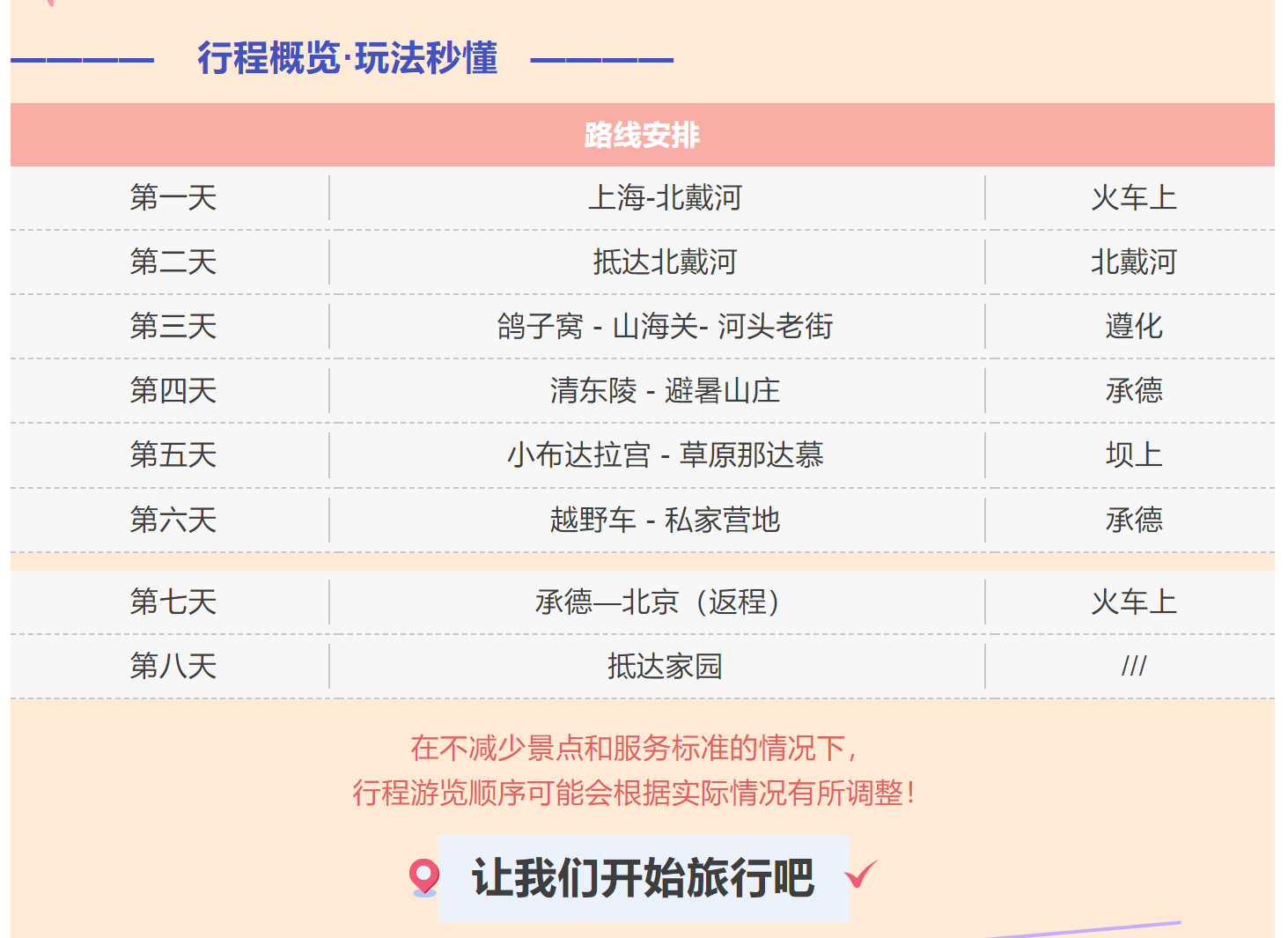 D1 ✦ 上海-北戴河/山海关/秦皇岛 ✦ 出发!带着愉快的心情前往‘滨海小城---北戴河/国内唯一一个以皇帝名号命名的城市---秦皇岛/具有两京锁钥无双地,万里长城第一关的的历史文化名城的山海关’。 参考车次: 温馨提示:您的导游管家会在您出发的前一天的18:00前,以短信或者电话的方式与您联系,请保持手机通讯的畅通,力争您北戴河之行一切顺畅! ![]() ![]() D2 ✦ 抵达北戴河 ✦ 全天集合,抵达秦皇岛/山海关/北戴河,抵达后工作人员接站后入住酒店。 【晚间自由活动推荐】(根据时间自由活动)俄罗斯风情一条街,位于北戴河区著名景点老虎石公园北侧。该街建筑特点具有的欧式建筑形式、符号及色彩,营造了浓郁的西洋文化氛围。品尝北戴河特色海鲜、皮皮虾、螃蟹、各种鱼类、贝类。您也可自行前往【滨海大道】【石塘路步行街】第一时间拥抱大海,租单车海边骑行、逛夜市、吃大排挡。 【温馨提示·吃海鲜注意事项】 抵达日全天无餐,抵达秦皇岛后您可自行前往推荐餐厅或自行挑选餐厅品尝小岛当地地道美食 1、来北戴河不可错过的当属海鲜了,若想吃的好还省钱,可以早起去石塘路市场直接自己买新鲜海鲜 2、尽量挑选活的海鲜,尤其是死蟹不要买来吃。海鲜搭档:生姜、醋、酒,吃螃蟹时一定要蘸着姜末和醋 3、推荐找个饭馆去加工,选择四季营业当地人常去的地方以防被坑,给些加工费、再点个小菜和主食即可。 ![]() ![]() D3 ✦ 北戴河—唐山/遵化 ✦ 今日亮点:景点:鸽子窝 山海关 老龙头 早餐后游览北戴河【鸽子窝公园】【游览约2小时】,登到最高点——鹰角亭,可以远眺候鸟栖息地、中国保存最完好的湿地——鸽子窝大潮坪。 ![]() 游览【山海关】历史文化名城山海关【玩味逛古城】,山海关古城西门(迎恩门)。到承恩驿皇家驿站门前聆听乾隆与刘墉书写“祥霭榑桑”君臣匾的历史故事,了解驿站与闯关东文化的联系。明清一条街外观总兵府——甲申史鉴馆,百年民俗文化特产老店关源昌,了解山海关商贾文化! ![]() 前往【豪华海上帆船】120元/人赠送(因天气原因或个人原因.不能参加此项目费用不退)面抚海风远眺大海,在海鸥引领下遨游;蓝色海洋之中,留下一串串白色的浪花,观北戴河碧海、蓝天、翠柏、绿树、红墙。 ![]() 中餐安排特色(山海关荤锅)将祖传秘方炖制的老鸡汤、特制腌酸菜、精选五花肉、丸子、焖子、冻豆腐、各种海鲜放入锅中,以炭火炖制,极具特色。白肉肥而不腻,丸子香嫩爽滑,酸菜解腻适口,海鲜提味独特,冻豆腐吸油爽口,让人百吃不腻,回味绵长 ![]() 前往【河头老街】见证了唐山地区的历史变革,老街融合汉唐文化与空间景观,打造特色商业聚焦区、文化旅游综合体,以河头文化为核心、大唐盛世场景为主线,将现代潮流文化与本土民俗文化、庙会文化深度融合,让您沉浸式体验“ 日看千人拱手、夜望万盏灯火 ”的大唐盛世场景。之后前往酒店办理入住。 ![]() ![]() D4 ✦ 遵化—承德 ✦ 今日亮点:景点:清东陵 避暑山庄 早餐后游览【清东陵】,参观十一华里的神道,道路弯曲自然,古桥重重,石像生端丽两侧;乾隆皇帝之峪陵,地面建筑精巧,地下宫殿华贵精致,是一个不可多得的精美的地下佛堂;普陀峪定东陵——(慈禧陵),地面建筑豪华富贵,金碧辉煌,是清东陵地上建筑之最;裕陵妃园寝里安葬着乾隆皇帝的36位爱妃,其中有香妃之陵,不同级别的人物墓葬规格不同,让人深深的感受到古代等级规制的森严。后乘车前往承德。 ![]() 中餐后 游览世界上现存最大的皇家园林—【避暑山庄】:它是一个近300年的中式庭院,过去这里只住过一户人家--爱新觉罗,如今它属于全世界。避暑山庄东南多水、西北多山,是整个中国地貌的缩影,建筑格局体现了皇权至上,“移天缩地在君怀”的造园特色!这里的烟雨楼就是《还珠格格》中的漱芳斋,您可以亲手抚摸小燕子爬过的百年古松;到梁家辉《火烧圆明园》取景地金山亭乘乘凉。避暑山庄为何如此凉爽?它的建造又有哪些政治意义?我们的金牌导游将逐一为您揭晓答案。入住酒店。 ![]() 友情提示: ①避暑山庄内讲解器20元/人自愿自理 ②避暑山庄内有三种小交通(环山车60元/人,环湖船70元/人,观光车50元/人;根据自身情况自愿自理乘坐) ![]() 晚间可打卡:【二仙居步行街】★★★★★ 夜幕降临,华灯初上的时候,承德市夜二仙居美食广场霓虹闪烁,人头攒动,熙熙攘攘,前来品尝特色小吃的市民和游客络绎不绝 ![]() 【鼎盛元宝街】★★★★★ 树立城市商业新地标,元宝街打造城市夜生活聚集地,打卡圣地,更有态度的美食生活品质。 ![]() ![]() D5 ✦ 承德—坝上 ✦ 今日亮点:小布达拉宫 坝上 草原那达慕 早餐后游外八庙中占地面积最大的【普陀宗乘之庙和须弥福寿之庙)(车程15分钟),普陀宗乘之庙因外形酷似西藏拉萨的布达拉宫而得名小布达拉宫,须弥福寿之庙则是仿日喀则扎什伦布寺而建,寓意像须弥山一样多福多寿,看彩旗飘飘,得长寿平安,是您拍照留念的首选 ![]() 中餐后乘车前往出发前往木兰围场,中国最大的“皇家猎场”【木兰围场乌兰布统】位于承德围场县,是木兰围场的一部分。这里在清朝时曾是皇家的狩猎场,有广袤的草原和森林,还有湖泊和山丘点缀其间,一片塞外风光,景色优美。因康熙皇帝指挥清军大战噶尔丹而著称于世,更以其迷人的欧式草原风光成为中外闻名的影视外景
