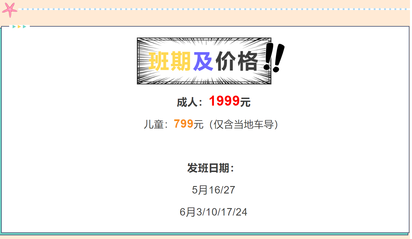 3、儿童说明:1.2米以下儿童收费标准(含目的地用餐、全程旅游车位、综合附加值及导游服务)其他费用敬请自理;