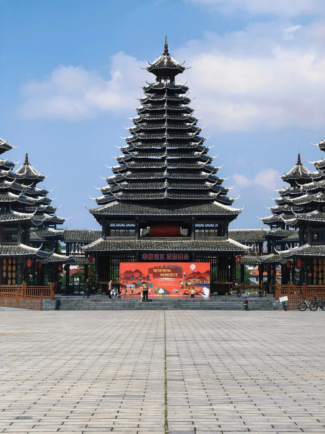 后游览【万和鼓楼】位于县城舞水河东岸,是侗族标志性建筑。2005年建成,由中心芦笙楼、琵琶楼、地筒楼与两个对歌楼五个鼓楼组成,并由360个龙灯组成的的檐廊将外围四个鼓楼相连,围成一个圆宝,护住中心鼓楼,比喻龙到此处护着宝永远不走了。
