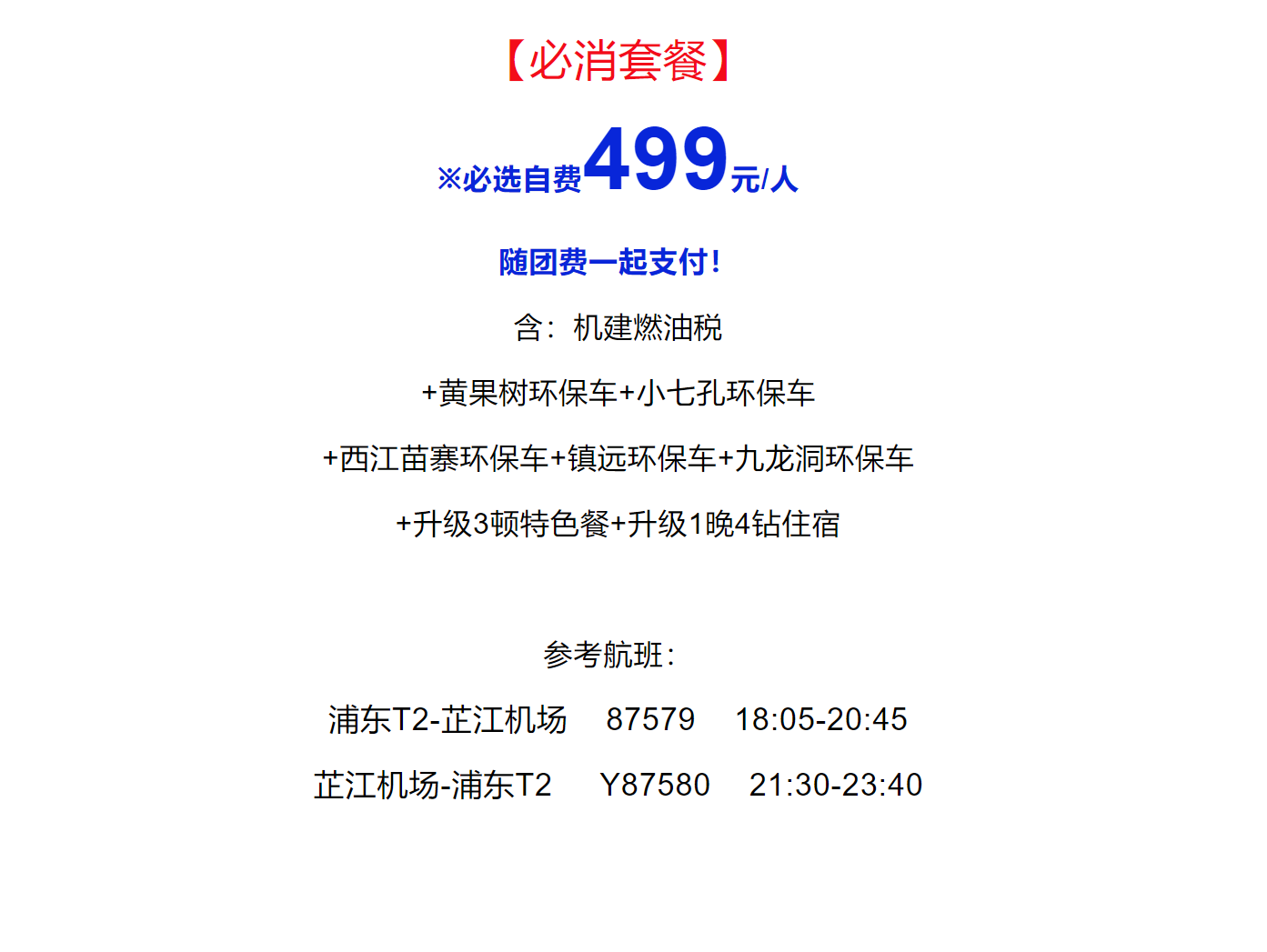 用房:全程入住2晚3钻酒店+升级一晚网评四钻+一晚西江客栈