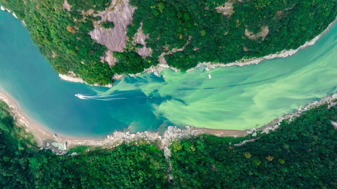 江水清澈见底,两岸青山如黛