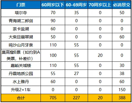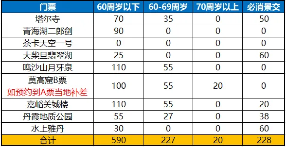 3. 门票补差(报名时一同支付):60周岁以下+590元/人,60-69周岁+227元/人,70周岁以上+20元/人;