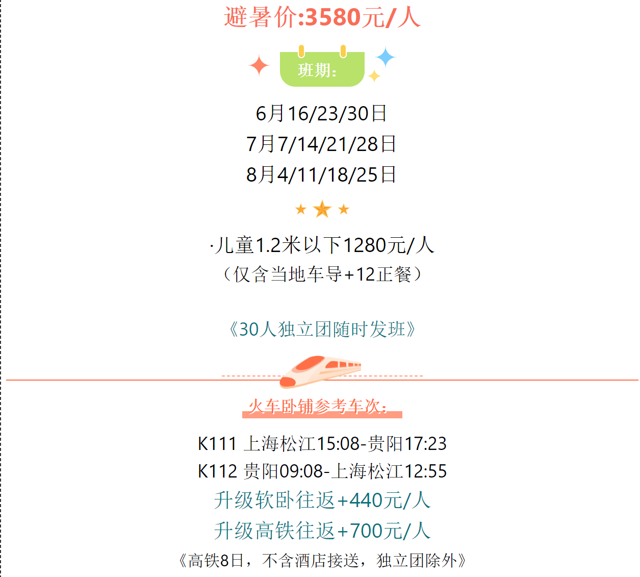 【交通】含上海-贵阳往返火车卧铺票(提前15天报名保证中下铺)+当地旅游空调车(一人一座);