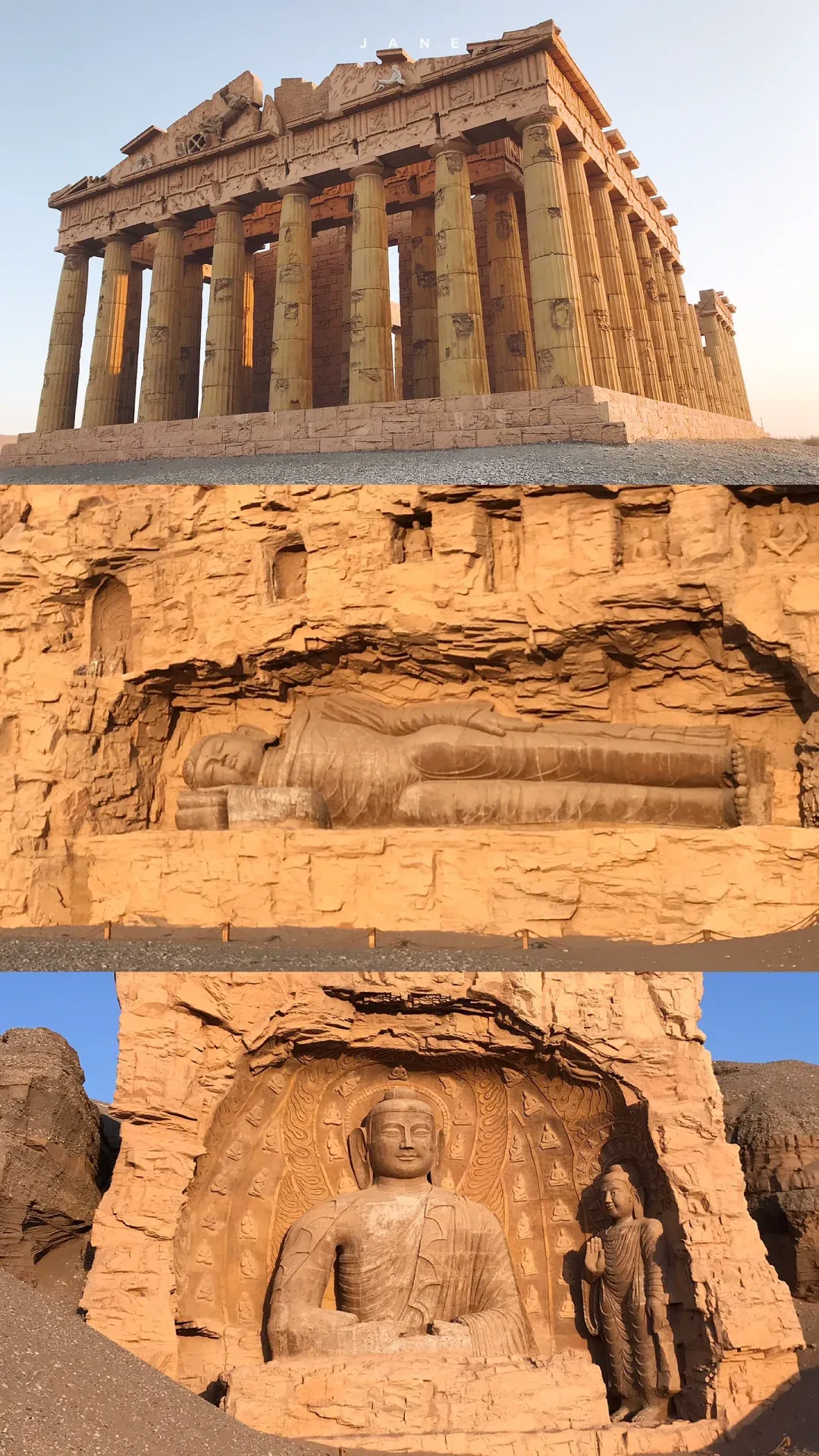 后前往【丝路遗产城】(含首道大门票)一个仿佛被时光遗忘的宝藏之地,这里矗立着古希腊风格的神庙和西域特色的城堡,每一处都散发着浓厚的历史韵味。站在这里,仿佛能穿越千年,回到那个辉煌的丝绸之路时代。