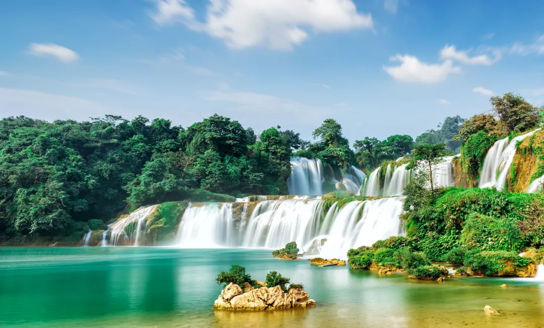 后乘车前往AAAAA级德天景区,游览【德天跨国大瀑布》景区(游览时间约2小时)(不含景区接驳车35元/人),徒步进入景区游览亚洲第一大、世界第四大跨国瀑布,瀑布由中国的德天瀑布和越南板约瀑布相连构成,横跨中越两国边境,宽208米,落差70米,纵深60米,三级跌落,雄奇壮阔!