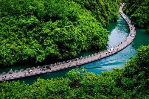 网红水上栈道如碧玉丝带蜿蜒峡谷间,驾车穿行激起涟漪万千,两岸青山夹道。
