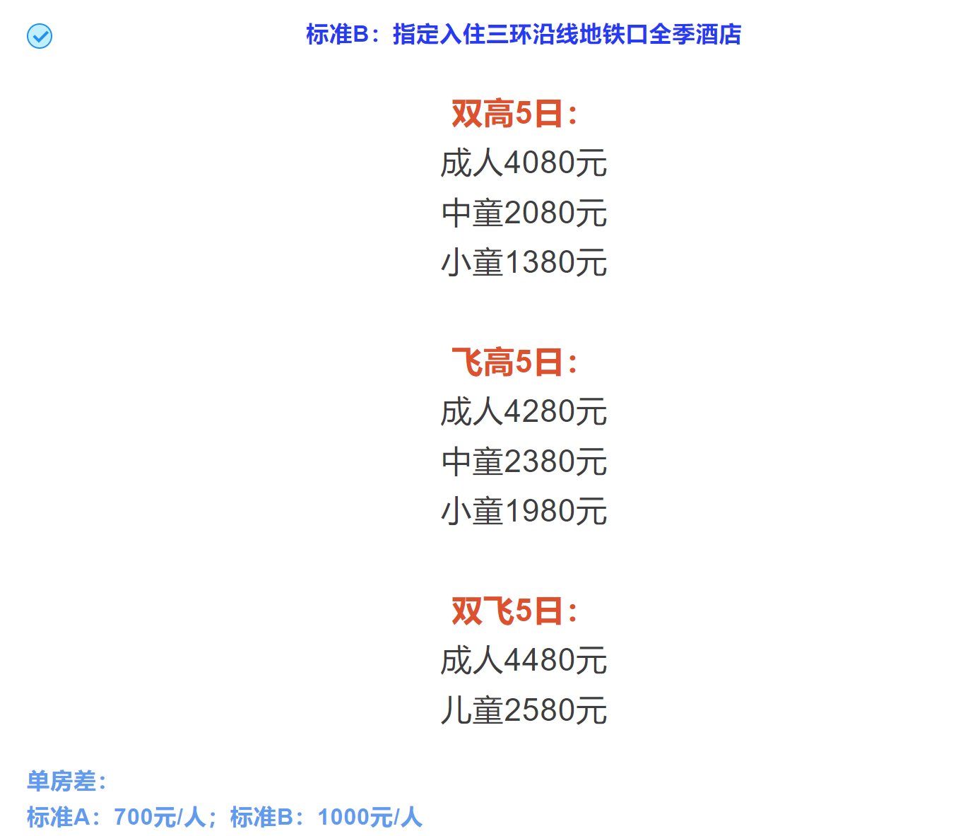 住宿标准B:指定入住三环沿线地铁口全季酒店。单人住一间房需补其房差800元全程。