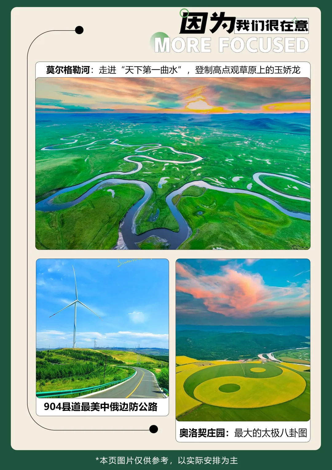 【中俄界河:奥洛契庄园】(已含门票,不含电瓶车15元/人景区内客人按规定时间自行浏览)在中国北方俄罗斯边陲,有个一眼望不到尽头的私家花园——奥洛契庄园,这里三面被俄罗斯环抱, 是北纬51度的最佳摄影天堂,更是花的海洋。(几乎每隔十天就有新的花开放,不同季节可以欣赏到不同美景)各种鲜花肆无忌惮的开放,静享清新空气、阳光雨露和美丽花海。【世界最大色彩太极八卦图】+【阳光花屋】+【VR眼镜体验】+【植物科普园】+【锦绣中华】(儿童游乐场)+【中俄界石】+【玻璃栈道】+【植物迷宫】。 穿越草原【 “颜色炫丽”吉普勇士越野车穿越“牧二代”私家营地(活动已含)】越野车穿越平整的草原像绿油油的地毯,远处山峦起伏,朵朵白云山边飘来,走一段不平凡的路,感受草原深度风光。【天空之境(赠送)】用动作和热情远离喧嚣,放飞心灵,真实的将自己融进这一片碧绿草场中,邂逅镜像中的草原大片。【网红打卡区(赠送)】一切美好的事情都是从网红打卡开始,这里有网红天梯、草原千古情、天使之翼等打卡点。