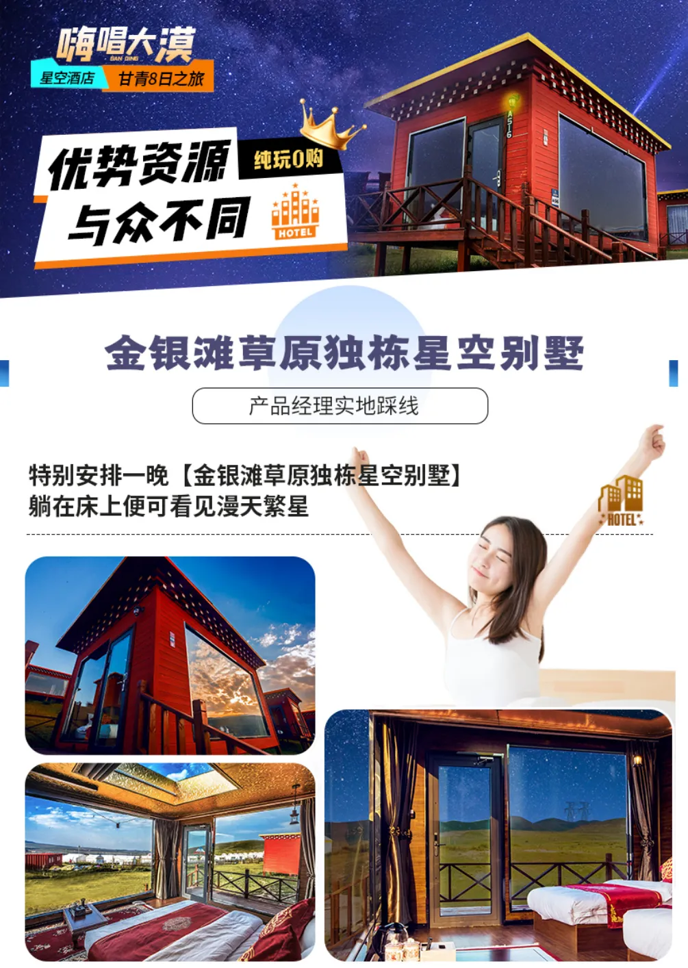 全程甄选网评3钻酒店,独家安排1晚草原星空独栋别墅(4月21日之前不开放,不安排),升级1晚网评4钻酒店,保证2晚兰州市区住宿;不含单房差;如儿童不占床,需自理早餐费,如遇满房,我社有权调整至同等级酒店