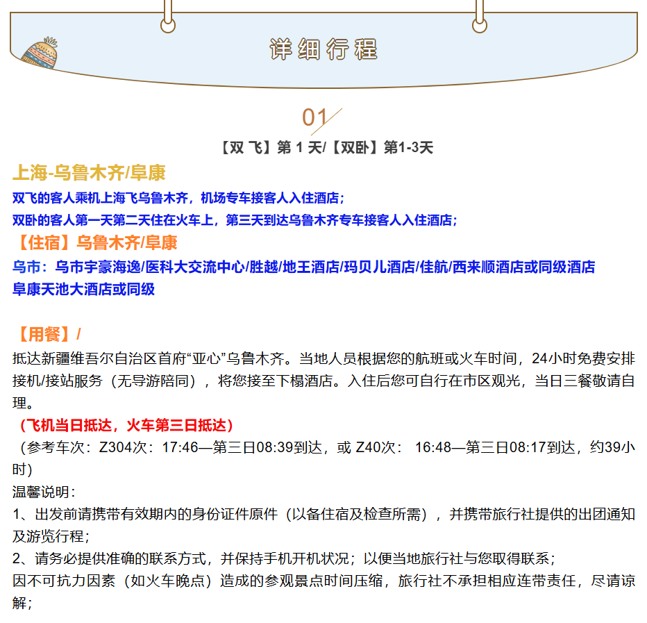 双卧的客人第一天第二天住在火车上,第三天到达乌鲁木齐专车接客人入住酒店;