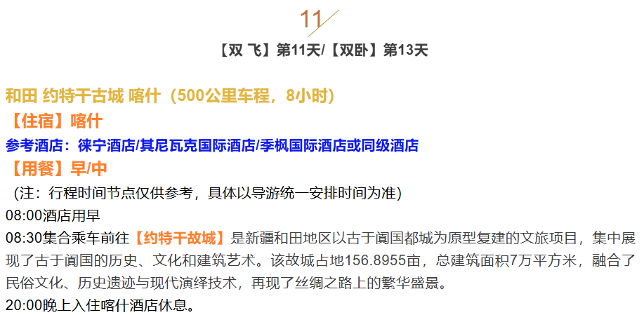 10:00早餐后前往【喀什老城】(含门票,游览约1小时),参加【老城开城仪式】,体验当地古朴维吾尔族人载歌载舞的欢乐场景。您想进一步了解当地维吾尔人的生活风情,就要去老城里看看,喀什老城新疆喀什市区中心,拥有百年历史,是喀什噶尔和维吾尔经典文化的代表。后参观中国影响力最大的伊斯兰教清真寺--【艾提尕尔清真寺】(与喀什噶尔古城合票,40分钟),该寺建于公元14世纪,具有鲜明的伊斯兰和维吾尔建筑风格,使你了解浓郁的穆斯林文化;参观南疆维吾尔最具代表性的古建筑群落—喀什噶尔古城(与清真寺合票),这座5A级景区被誉为‘最后的西域,活着的古城’