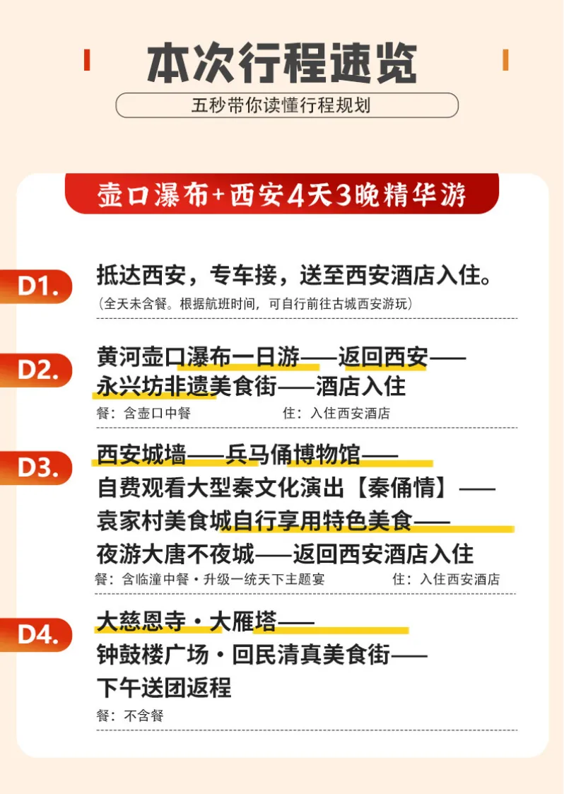 1:壶口瀑布景区一日游因距离较远,当天出发要早于其他日常时间,以导游通知为准。