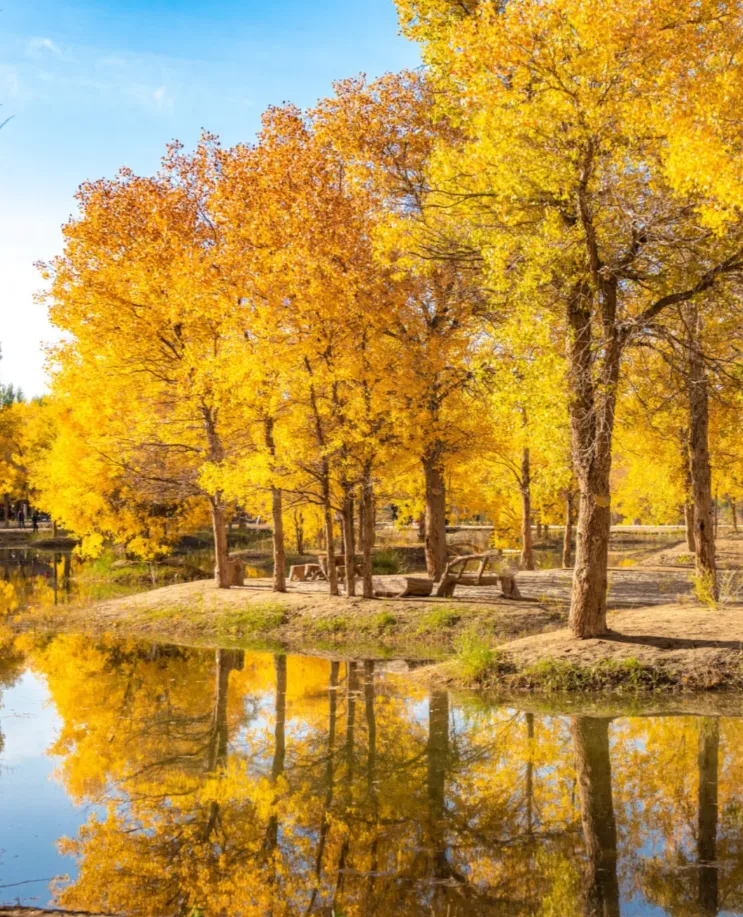 ●一道桥(祈福林/淘来林)、 ●二道桥(倒影林)最有名的是倒影 林,金黄色的胡杨林与黑水河之间形成倒影,一直深受摄影家 们的喜爱。充满原始风貌,有黑水河水道穿过,水道宽阔,两 边长满金黄的胡杨树,间有蒙古包和绵延的沙丘做陪衬,是最 佳的摄影的好地方。景区内设有专门的拍摄平台,以便游客在 最佳的位置拍照。
