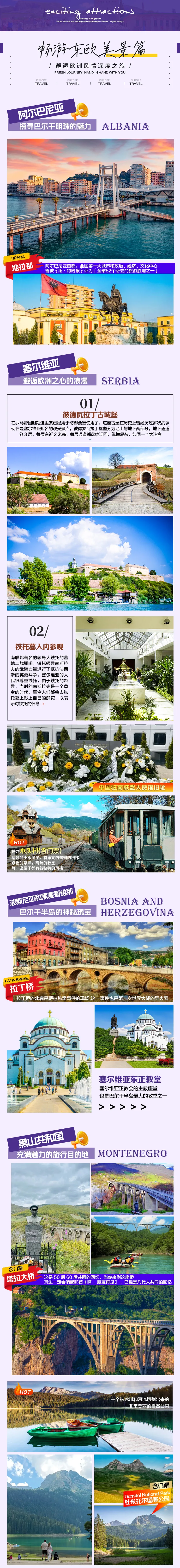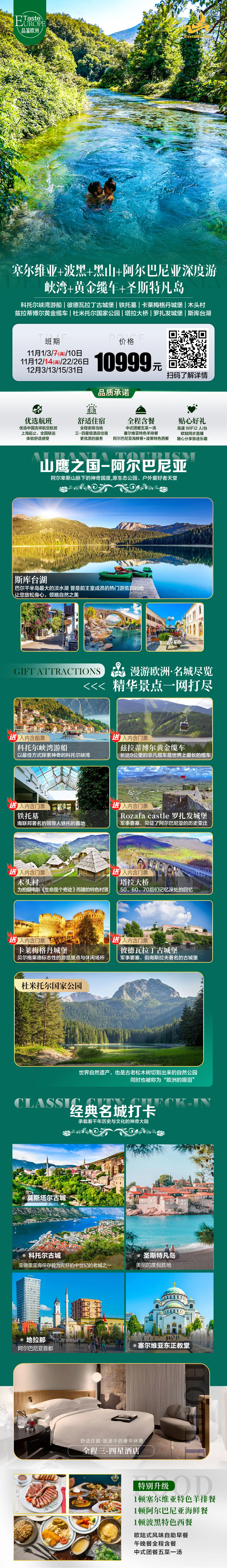 3) 所含景点首道门票(其余景点均为外观):铁托墓、杜米托尔国家公园、木头村、黄金缆车、峡湾游船、罗扎发城堡、斯库台湖