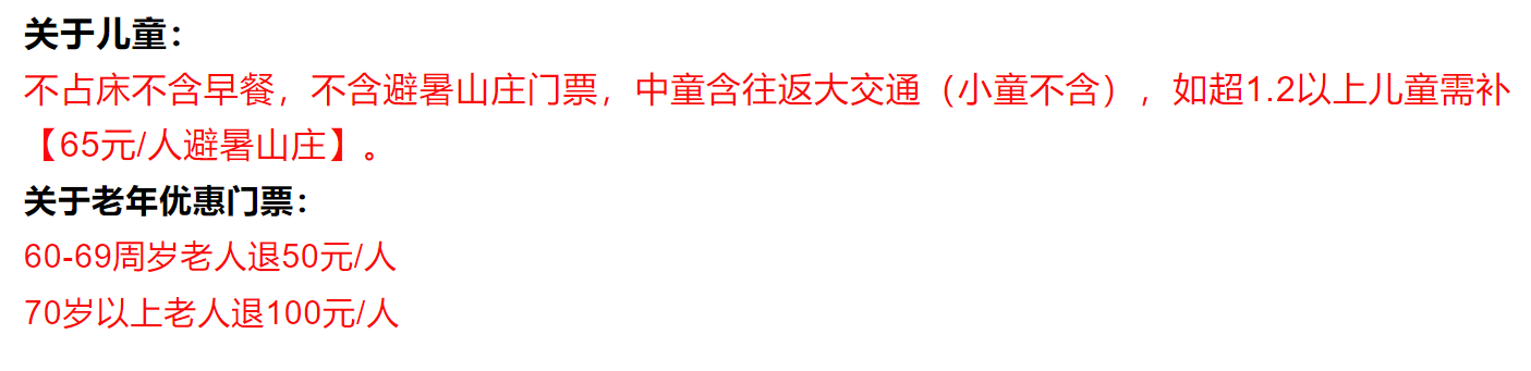 不占床不含早餐,不含避暑山庄门票,中童含往返大交通(小童不含),如超1.2以上儿童需补【65元/人避暑山庄】。