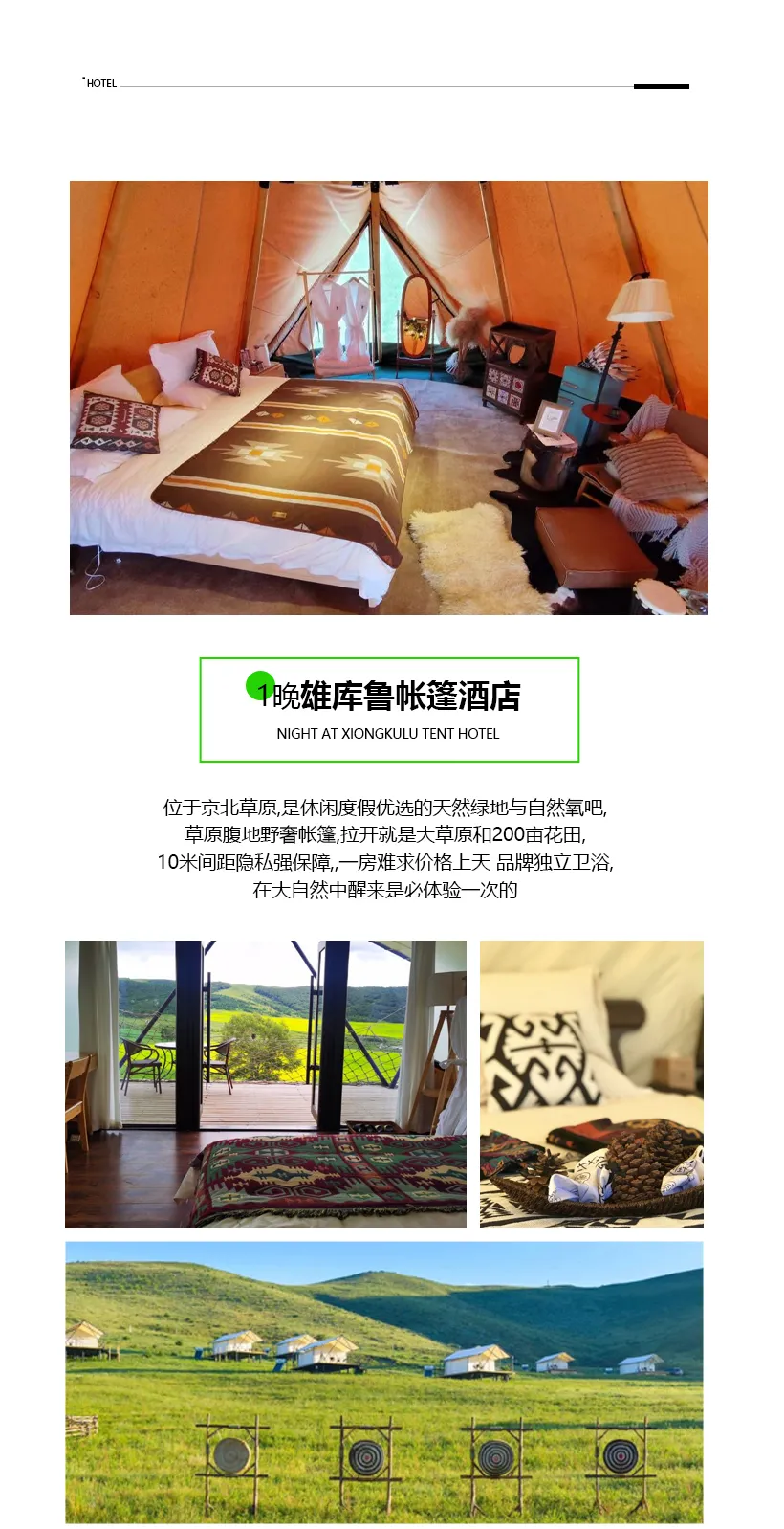 2、住宿:1晚推窗即是海四钻,2晚网评五钻酒店,1晚网评四钻,1晚特色雄库鲁帐篷;