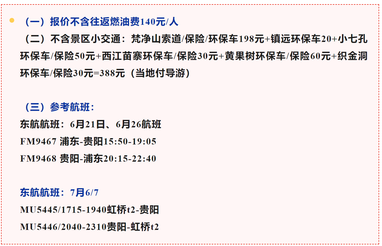 2.不含景区小交通:梵净山索道/保险/环保车198元+镇远环保车20+小七孔环保车/保险50元+西江苗寨环保车/保险30元+黄果树环保车/保险60元+织金洞环保车/保险30元=388元(当地付导游)