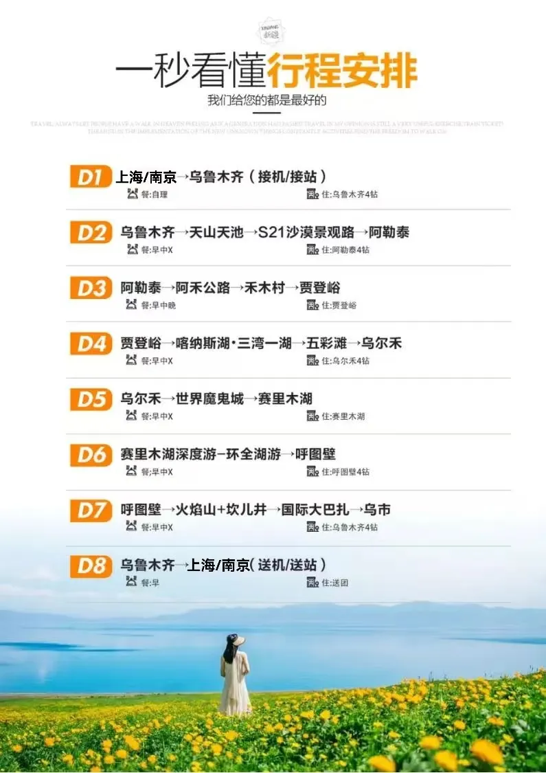 气候提示:新疆昼夜温差较大,请自备合适衣物。帽子、太阳镜、防晒霜必备;