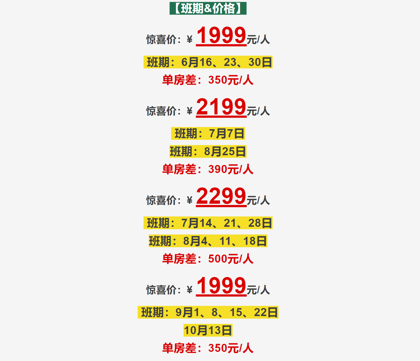 4. 年龄差价(与团费一同支付):60-69周岁+193元/人;60周岁以下333元/人