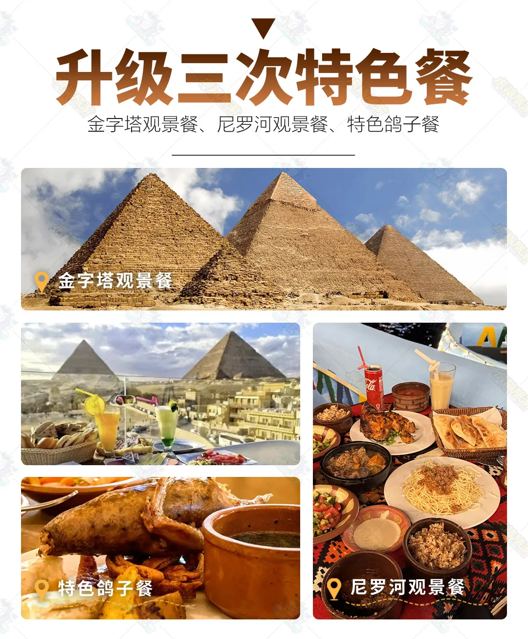 ■ 特别安排四:升级3次高餐标特色餐:金字塔景观餐、尼罗河景观餐、特色鸽子餐;中式团餐8菜1汤;