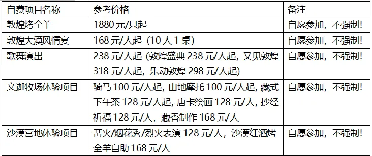 1、上述安排是为了丰富旅游者的娱乐活动及购物要求,旅游者自愿选择,如不参加自费项目的旅游者,可以在规定时间内在景区附近自由活动;