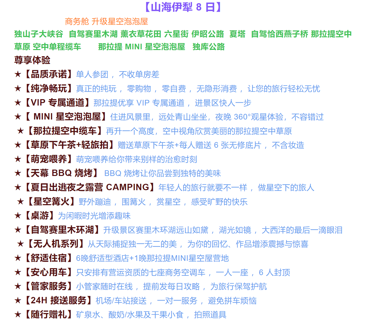 新源-那拉提空中草原(享 VIP 通道)-空中单程缆车-下午茶+轻旅 拍-那拉提镇露营活动:梦幻星空泡泡屋拍照打卡+BBQ 烧烤+萌宠喂养+桌 游 +篝火晚会-那拉提 MINI 星空泡泡屋(营地 5 月底营业,未营业之前安排其他民宿 ,营地活动无法安排 ,星空泡泡屋打卡无法安排 ,敬请见谅!) |