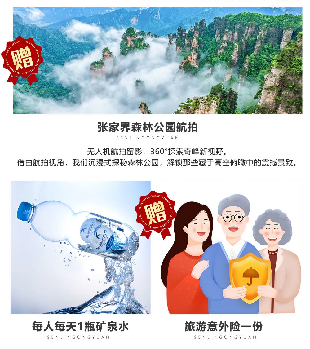 必消套餐:森林公园环保车+百龙电梯上行+天子山索道下行+凤凰古城+天门山扶梯+鞋套+老家寨船票+往返燃油税;统一打包价999元/人(请于报名时一同支付)