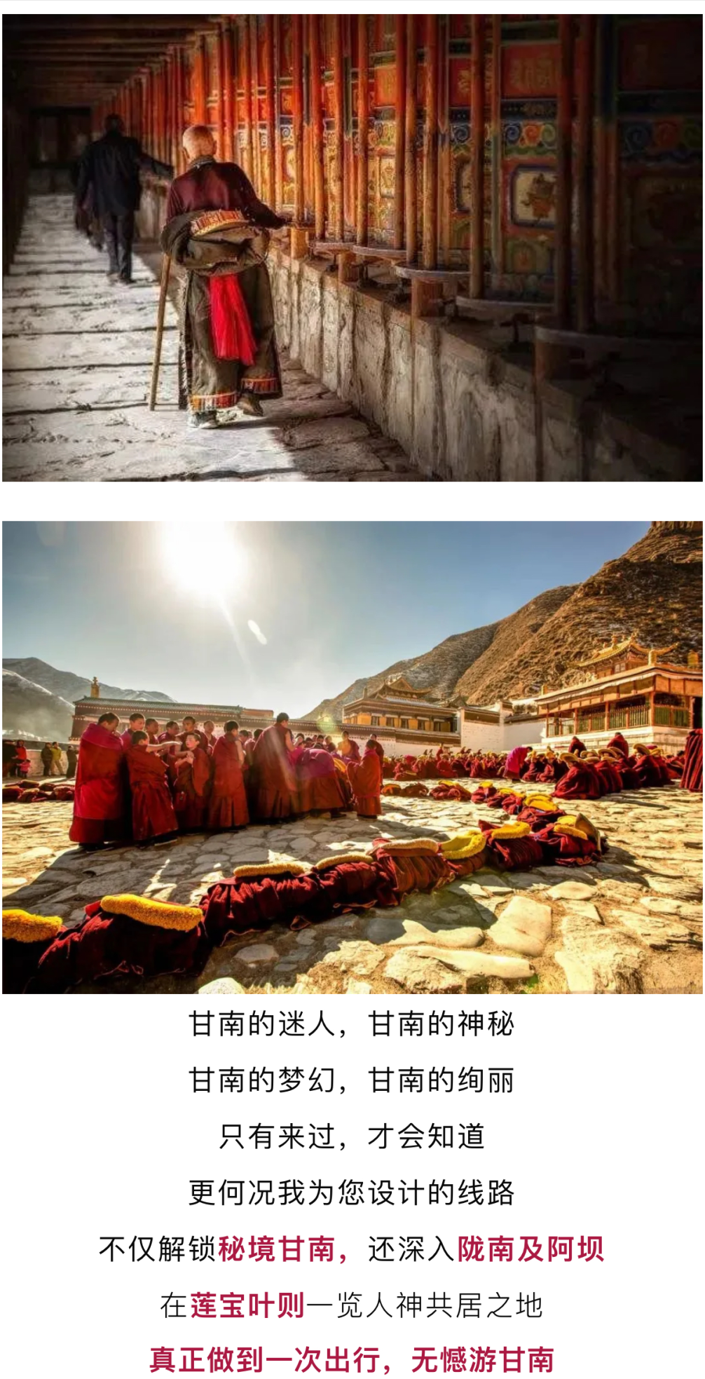 拉卜楞寺是藏语“拉章”的变音,意为活佛大师的府邸。拉卜楞寺在历史上号称有108属寺(其实要远大于此数),是甘南地区的政教中心,目前拉卜楞寺保留有全国最好的藏传佛教教学体系。拉卜楞寺下设六大学院,其中一个显密学院,五个密宗学院。拉卜楞寺成为一个具有6大学院,48座佛殿和昂欠(活佛住所),500多座僧院的庞大建筑群体,列居格鲁派六大寺院之一,在安多地区有“卫藏第二”之称,享有极高的声誉。让您置身佛国感受藏传佛教的博大精深。拉卜楞寺拥有世界上最长的转经长廊,共有一千七百多个转经桶,环绕整个寺院,绵延3.5公里长,很是壮观。要转完所有的转经筒,大约需要两小时。长长的转经长廊,是藏民的希望之路,是灵魂超越尘世进入天国之路。虔诚的朝拜者,手持并轻摇铜质的或大或小的经筒,口吟六字真言,目光坚定而无杂念,在他们心中的圣路上永不停息的朝拜着。慢慢的拨动转经筒,绕着偌大的寺庙,抑或转经道一圈圈走着。这里是电影《天下无贼》的拍摄地,亲眼目睹影片中万人朝拜的宏大场面(如遇政策性寺庙临时关闭则替换「米拉日巴佛阁」参观)。