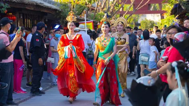 唐装汉服换装体验: 挑选一套心仪的华服,融入这条唐韵悠然的街区之中,贴花钿、点绛唇,描眉绾发、戴发簪,盛装打扮,为遇见整个盛唐做准备,以最美的姿态,留下最靓的唐风大片。