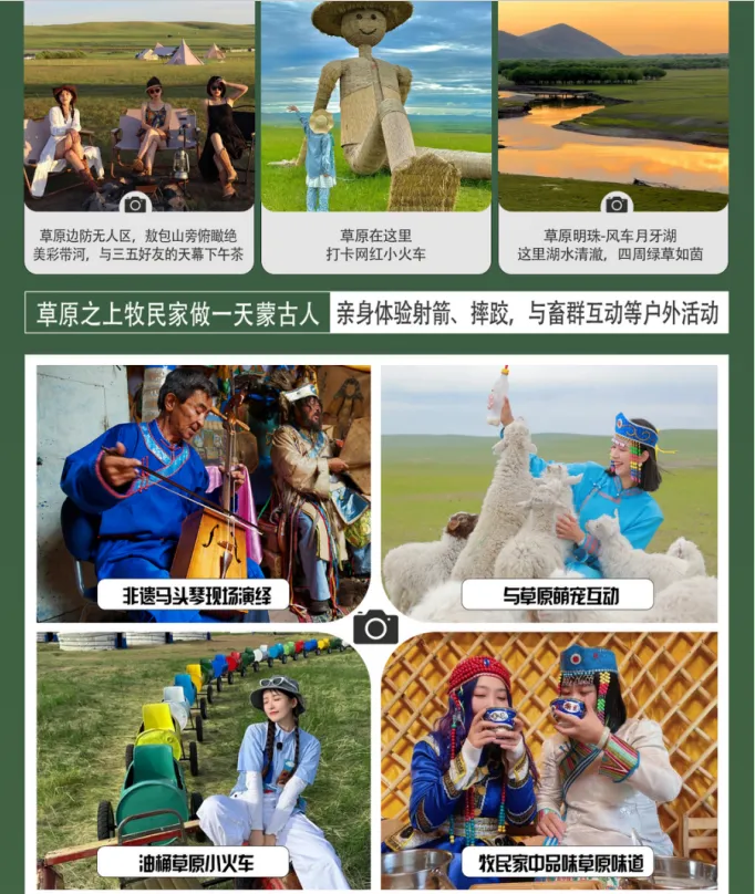 活动升级:客人可根据个人爱好在草原上自费升级骑马穿越活动(300-500元/圈)+草原观光小火车活动(150元)