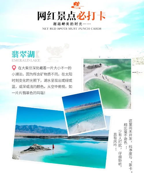【行程介绍】早餐后,参观【大柴旦翡翠湖】(门票已含)它安静地隐匿在大漠戈壁深处,如一块翡翠宝镜,映照着曼妙的身姿和容颜!艳阳下的翡翠湖犹如带滤镜的镜片镶嵌在祁漫塔格山下,焕发着祖母绿的宝石光。天地在此交汇为茫茫戈壁凭添了一抹似水柔情。之后前往茶卡镇,这里有被称为“中国天空之镜”的【茶卡盐湖】(门票已含)。在这里给大家留了充足的时间畅玩。白花花的湖面泛着青光,还要提前准备好凉鞋、拖鞋,爱美的姑娘记得准备一条色彩艳丽的长裙,我们在这里疯狂拗造型。傍晚到达德令哈入住休息。