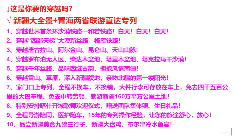 ❤❤本次专列带您深入新疆腹地,走遍天山南北,饱览西部美景,探索神秘西域风情, 去您一辈子想去而不易去的地方......