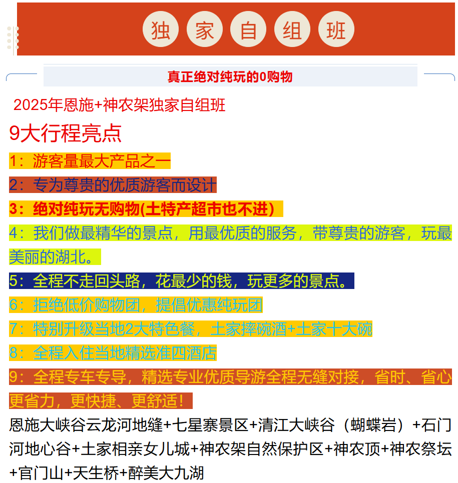 1、必须自理:499元/人(大峡谷换乘车+大峡谷地面缆车+清江大峡谷游船+石门河景交+神农架换乘车+大九湖景交车+特色餐+车导综合服务费)现付给导游
