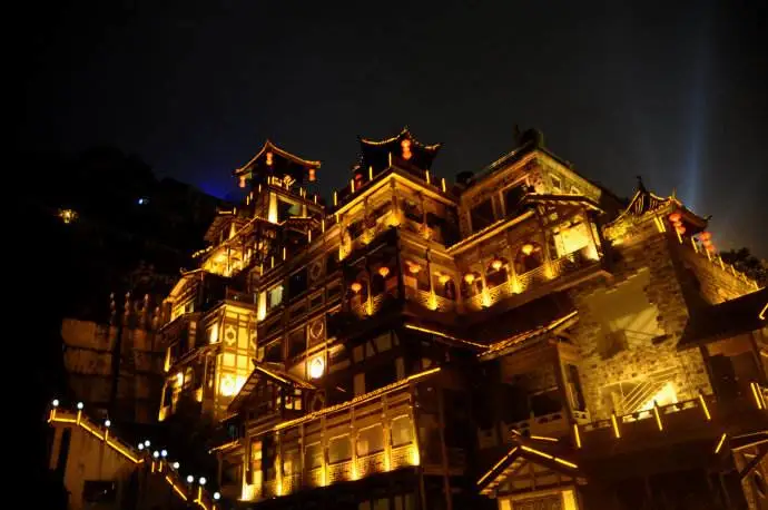观赏【洪崖洞风貌区】江景和城市风貌完美融合,以75米高的超常落差,顺崖而上,高低错落、依山而建,成为备受世界瞩目的,独特靓丽的城市名片。坐拥城市旅游景观、商务休闲景观和城市⼈⽂景观于⼀体。 以具巴渝传统建筑特⾊的"吊脚楼"⻛貌为主体,依⼭就势,沿江⽽建,让游客叹为观止。