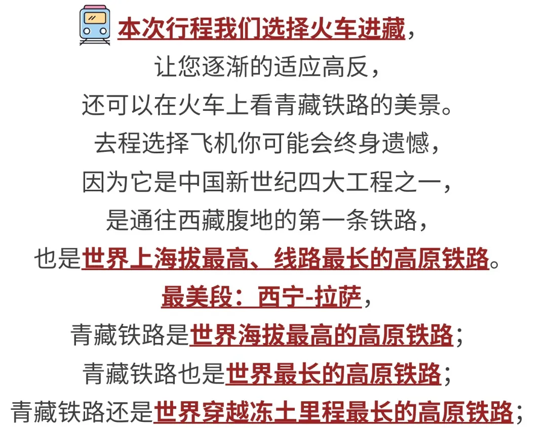 在火车上欣赏青藏铁路沿途观自然风光. 你将会发现青藏游的精彩程度远远超乎想象。【青藏铁路】是中国新世纪四大工程之一,是通往西藏腹地的第一条铁路,也是世界上海拔最高、线路最长的高原铁路。青藏铁路穿越了可可西里、三江源、羌塘等国家级自然保护区,因地处世界"第三极",所以说一定要坐一段西宁-拉萨的火车。沿途经过以下【青藏线著名景观】--昆仑山景、长江源景观带、可可西里无人区景观、藏北羌塘大草原美景、错那湖美景和那曲到拉萨草原田园过渡景观。穿越世界上最长的高原冻土隧道--昆仑山隧道、世界上最高的高原冻土隧道--风火山隧道、世界上海拔最高的火车站--唐古拉站、青藏铁路第一高桥--三岔河大桥、世界上最长的“以桥代路”高原铁路--清水河大桥、长江源头第一铁路桥--长江源特大桥等无数个之最。一路欣赏青藏线迷人风光,欣赏青藏高原的壮阔与秀美。
