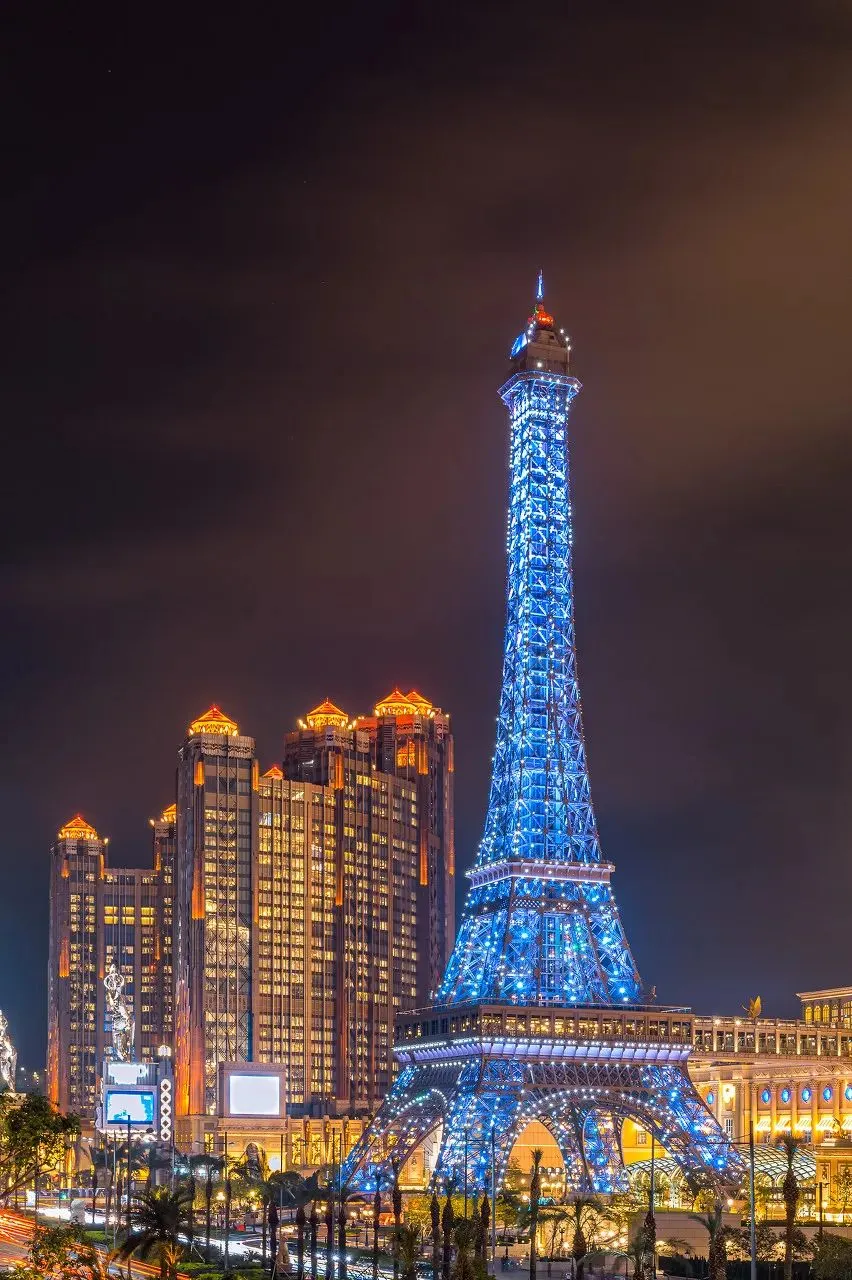 【澳门埃菲尔铁塔】以巴黎埃菲尔铁塔等比缩小一半精心建造,登上铁塔7楼让您在澳门也能体验巴黎的浪漫风情;