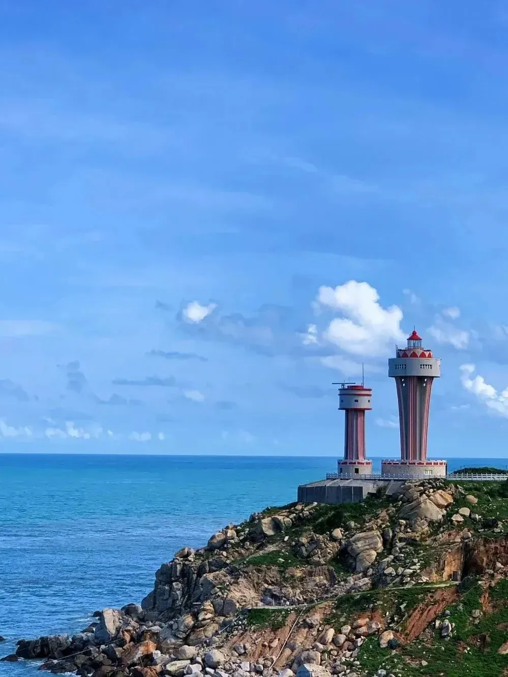 【长山尾灯塔】红色塔身,黄色基底,非常的鲜艳显眼,瞬间穿越到济州岛南澳第一站网红打卡点;南澳的东南方向,灯塔一到夜晚就亮起灯,为出海的渔船指引航港口,安静地屹立在山海交界之处,和周边的环境融成一幅绝美的风景;