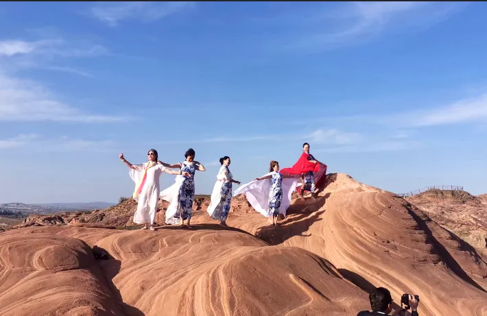 乘车前往靖边参观游览时间的纹路、上帝的指纹中国【靖边波浪谷】(玻璃桥50元自理)(游览时间约2-3H)近距离的感受丹霞地貌的魅力,由于地壳上升、岩石被流水切割侵蚀、山坡崩塌后才有了今天这鬼斧神工的美景,再次自由参观拍照后,波浪谷展示的是由数百万年的风、水和时间雕琢砂岩而成的奇妙世界。波浪谷岩石的复杂层面,是由一亿五千万前侏罗纪就开始沉积的巨大沙丘组成。沙丘不断地被一层层浸渍了地下水的红沙所覆盖,天长日久,水中的矿物质把沙凝结成了砂岩,形成了层叠状的结构。