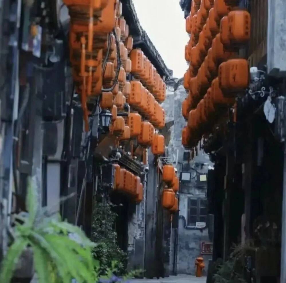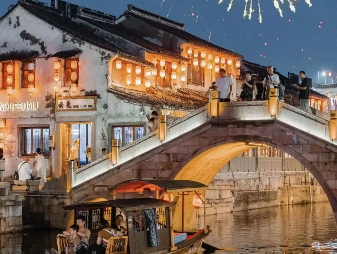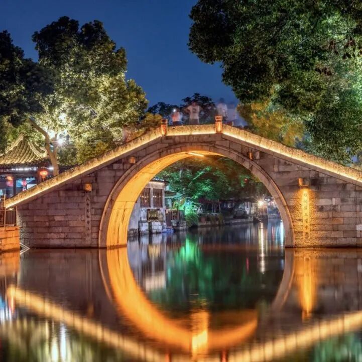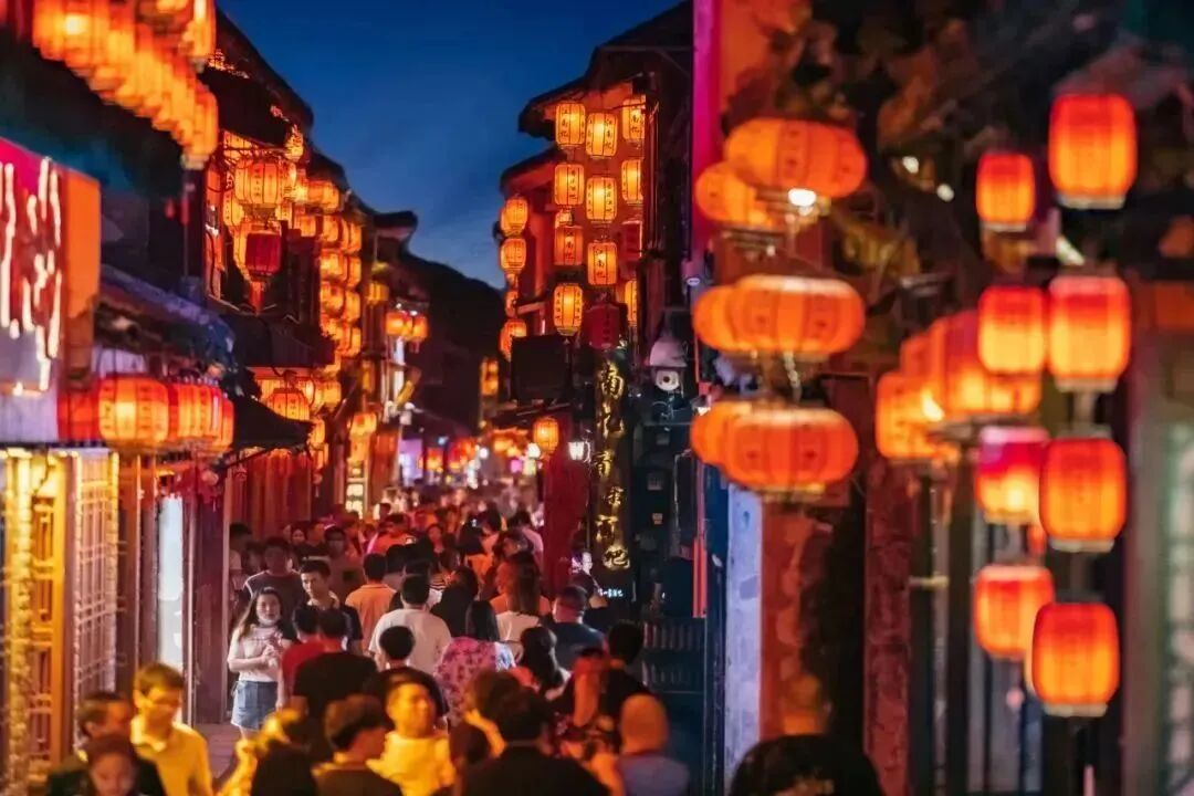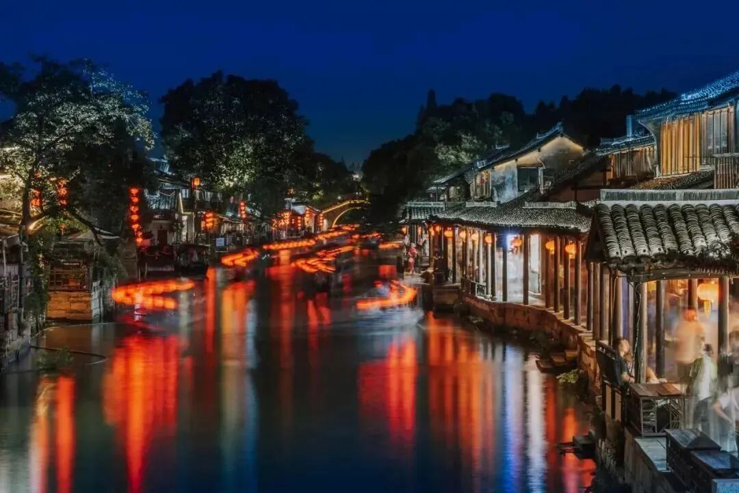 夜幕降临时,红灯笼倒映河中,更添诗意