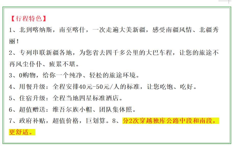 一次旅行游遍1/4中国,穿越丝绸之路,品味辉煌历史,深入新疆腹地,饱览西部美景,探索神秘西域风情 。新疆气候宜人景点丰富 ,专为中老年人量身定制 ,全程配备专职保健医护人员。