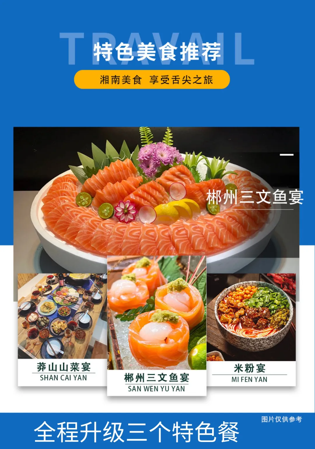 升级3顿特色餐:三文鱼宴+郴州米粉宴+莽山山菜宴(因瑶寨歌舞伴餐餐厅暂停开放换三文鱼宴)