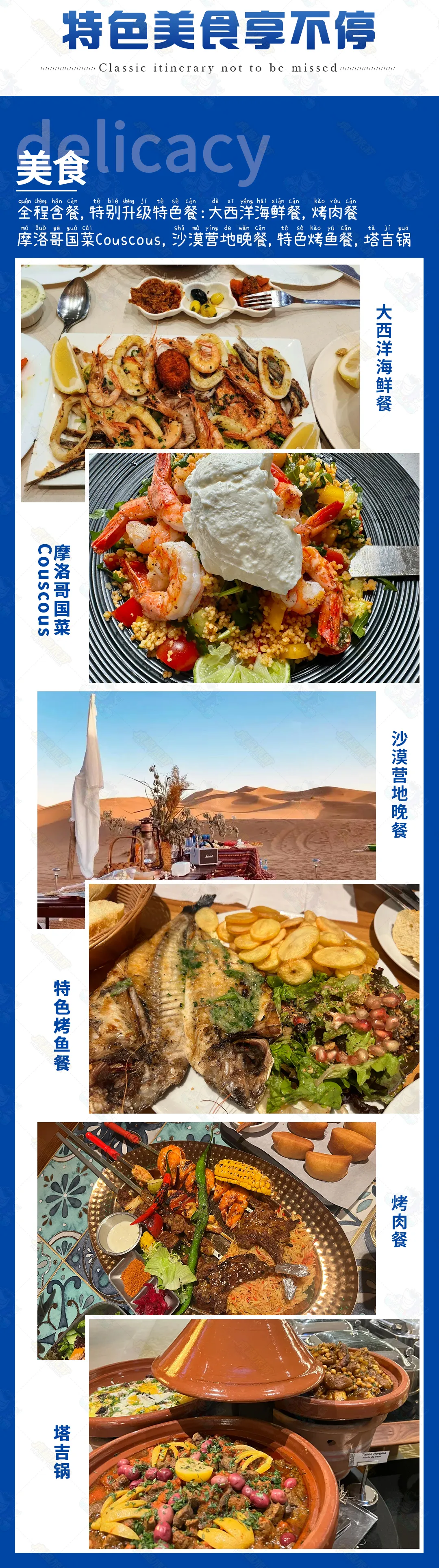 ●行程内所列餐食(早餐为酒店含早,特色美食:大西洋海鲜餐,摩洛哥Couscous,沙漠营地晚餐,特色烤鱼餐,烤肉餐,塔吉锅),行程中团队用餐客人自愿放弃费用不退。