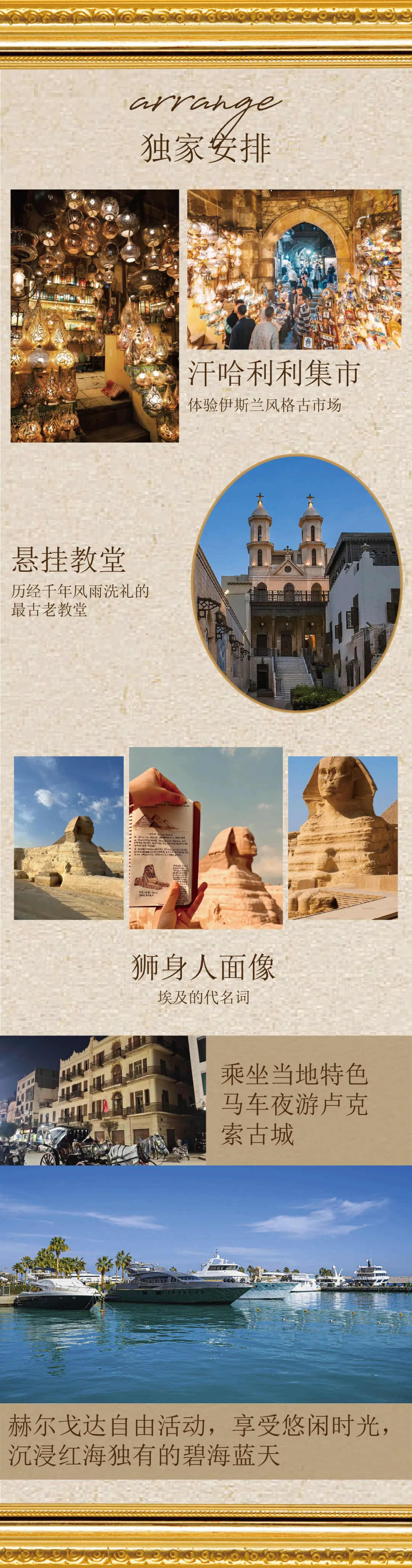 【狮身人面像】提起埃及的金字塔,便会想到狮身人面像,与金字塔同为古埃及文明具有代表性的遗迹,作为埃及的代名词,距今已有约4000年历史。狮身人面像是一座人脸狮身的雕像,前爪向前卧在沙漠上,整个雕像高约22米,长约57米,除了前爪外,原来的狮身人面像头戴皇冠,身上还有圣蛇浮雕,并留有长须,脖子围有项圈。但经过几千年来风吹雨打和沙土掩埋,皇冠、项圈不见踪影。【大埃及博物馆】★入内(含首道门票,游览时间约120分钟)筹备20年,耗资70亿的大埃及博物馆官宣7月3日开馆!!!金字塔脚下,占地50万平方米,堪称“地球级文物仓库”!!!这里收藏者10万件古埃及珍宝,其中3万余件首次曝光,图坦卡蒙5000+件陪葬品全公开,纯金人形棺,黄金人字拖......法老的“土豪金套餐”闪瞎眼!!!如果您也是博物馆爱好者,大埃及博物馆此生必看!!!【汗·哈利利集市】(游览时间约60分钟)汗·哈利利市场是一个伊斯兰风格的古市场,由分布在几十条小街巷里的几千家个体小店组成,据说是阿拉伯世界最大的集市,来开罗必逛。迷宫般的街道两旁店铺一家挨一家,大都出售金银首饰、铜盘、石雕、皮货、地毯及其它埃及传统手工艺品,也有经营服饰、食品、土特产的小店。许多店主都会几句简单中文,市场中热情揽客的商贩与嘈杂的杀价声、四处弥漫的香料味与琳琅满目的小玩意,定会让您流连忘返。即使不买东西,这里也是感受当地风情和拍照的好地方。