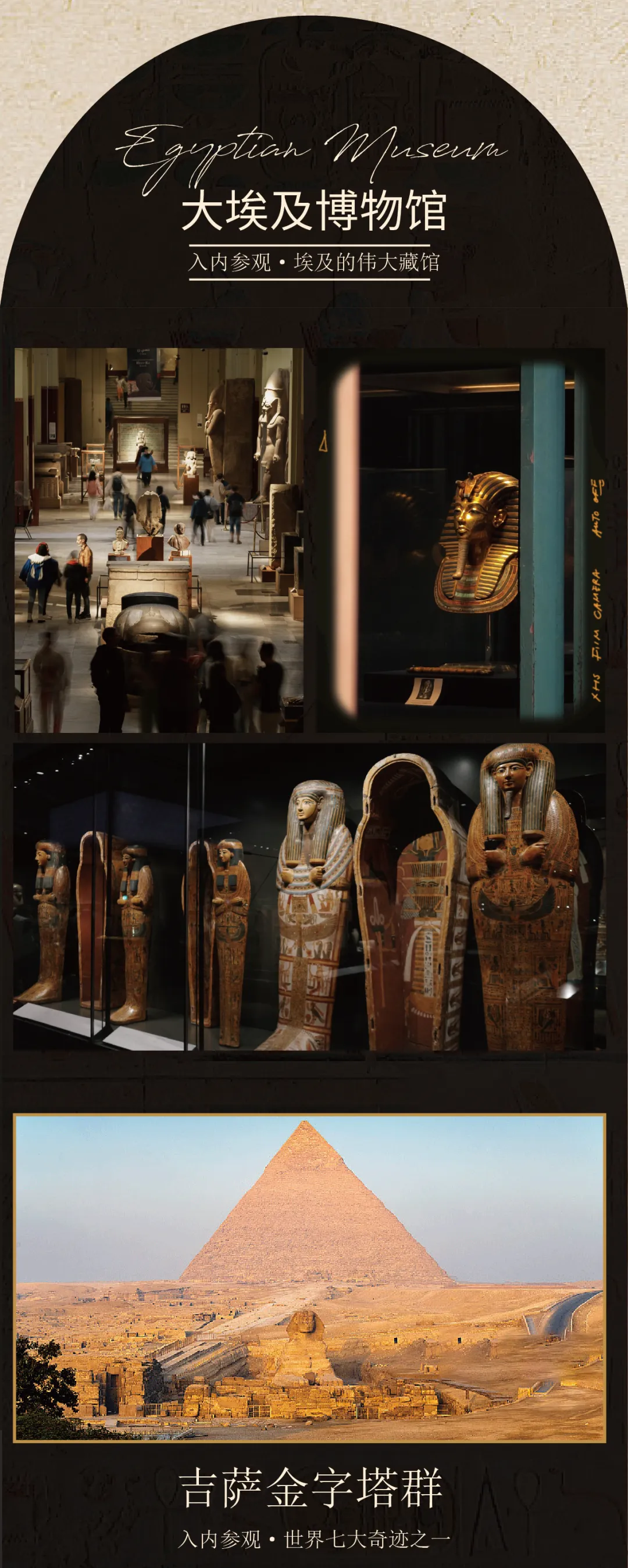 温馨提示:如需进入胡夫金字塔内看石棺需自行购票入大塔或小塔,每天有名额限制进入;悬挂教堂为赠送景点,如遇闭馆则调整为外观,无费用可退,敬请理解;大埃及博物馆如遇政策性关闭则替换为埃及博物馆入内,无费用可退,敬请理解~