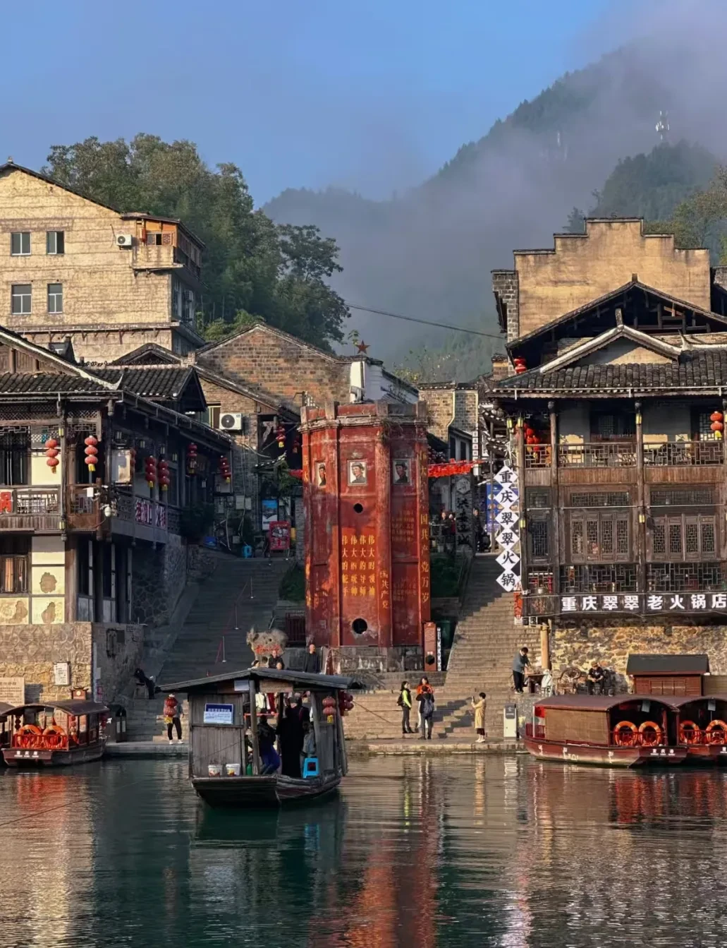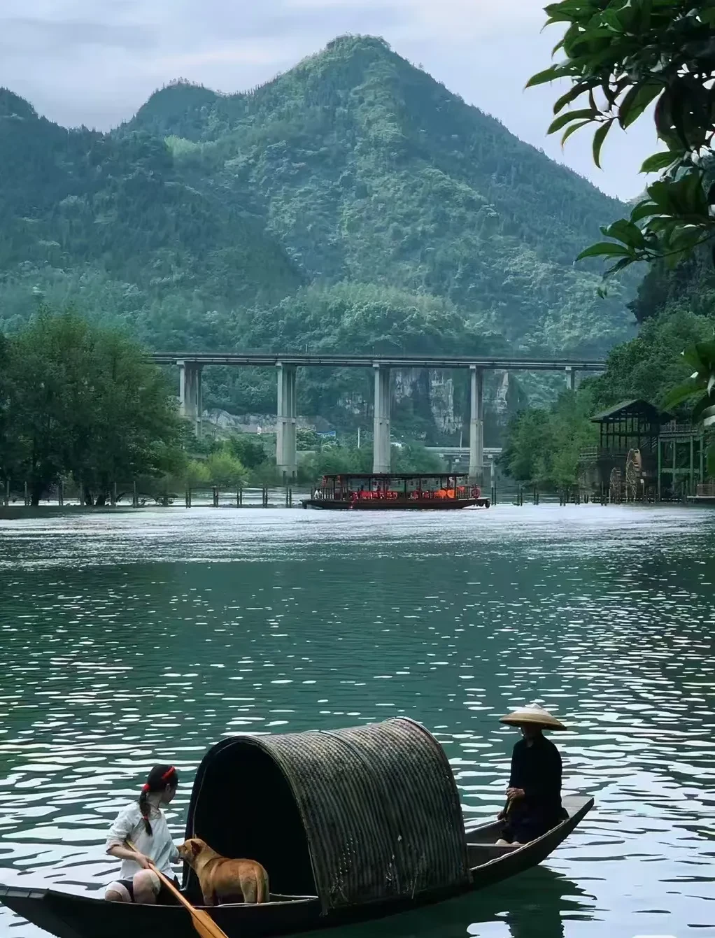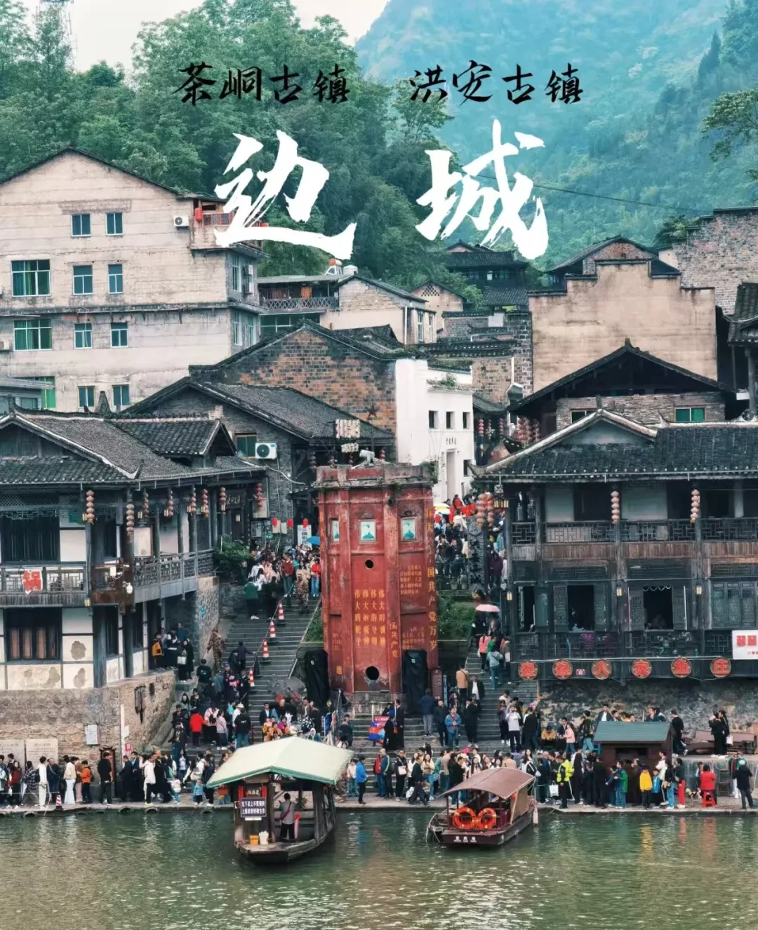 BUS赴鸡鸣三省的【重庆洪安边城】,坐乌蓬船体验拉拉渡,洪安古镇,位于长江上游地区、重庆东南部,秀山县境东南,距县城47公里,是重庆、贵州、湖南三省市交界之地,有“渝东南门户”之称,是一脚踏三省的插花地,也是沈从文笔下的《边城》原型。清代名人章恺曾诗曰“蜀道有近时,春风几处分;吹来黔地雨,卷入楚天云”,描绘了“一脚踏三省”的地利之优。洪安古镇内古建筑群立,其工艺、造型独特,土家苗寨风情别具一格。自然景点“象鼻吸水”、“九龙坡”以及“三不管”小岛都享有盛名。洪安全镇依山傍水,绿树成荫,河水碧波荡漾,风景如画。洪安老街最有味道的是索拉渡河船,由一根钢丝连接两岸码头,也系住了渡船来往的动力依靠。满客之后,老梢公悠闲的坐在船屋内的木制四方条台上,用一根挖有细槽的两尺圆木作绞杆,卡在渡河钢丝上一点一点把船拖到对岸。