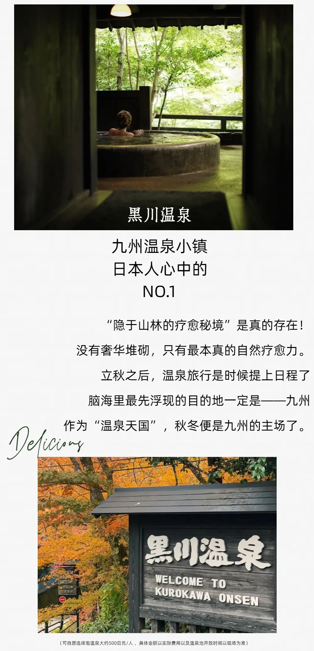 (可自愿选择泡温泉大约500日元/人 ,具体金额以实际费用以及温泉池开放时间以现场为准)这里有很多温泉旅馆,藏在深山之中,被红叶环绕,像《千与千寻》里的世界。黑川温泉尤其受年轻女性的欢迎,游客将自己置身于优美的自然环境中,静听溪水潺,感受清风拂面,尽情享受约30家温泉旅馆各具特色的“源泉溢流式”(源源不断地向浴池中注入新鲜的源泉水,使温泉水从浴池边缘溢出的方式)的露天温泉